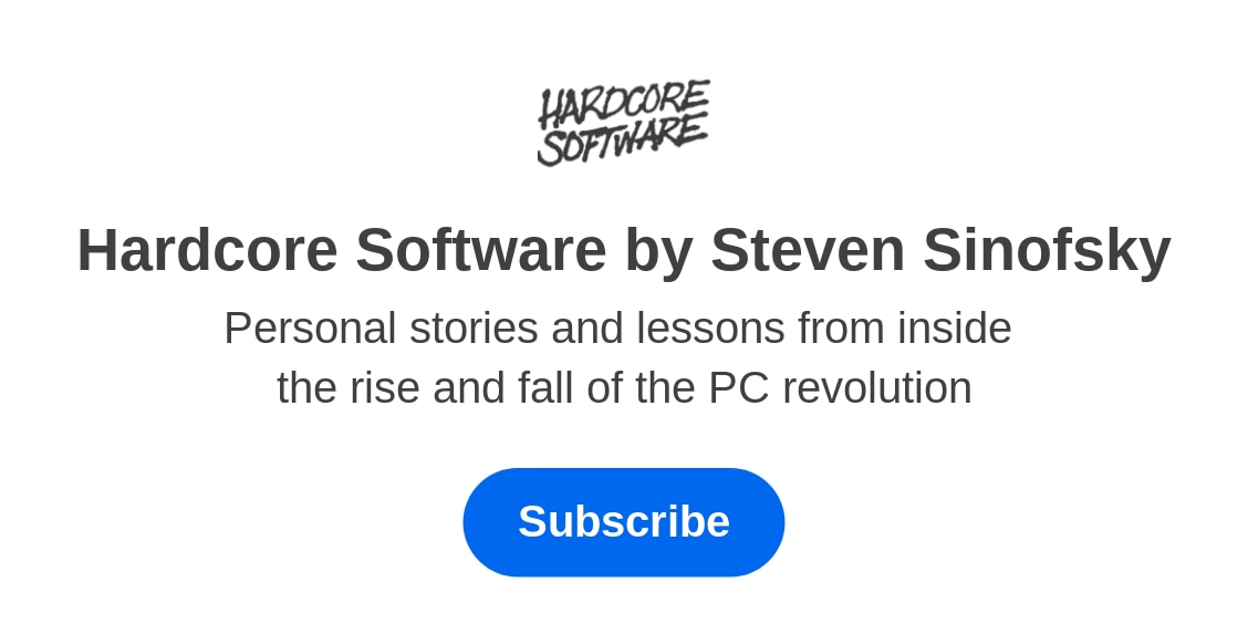 by Steven SinofskyPersonal stories and lessons from inside the rise and fall of the PC revolution. Click to read Hardcore Software by Steven Sinofsky, a Substack publication...hardcoresoftware.learningbyshipping.com · May 15